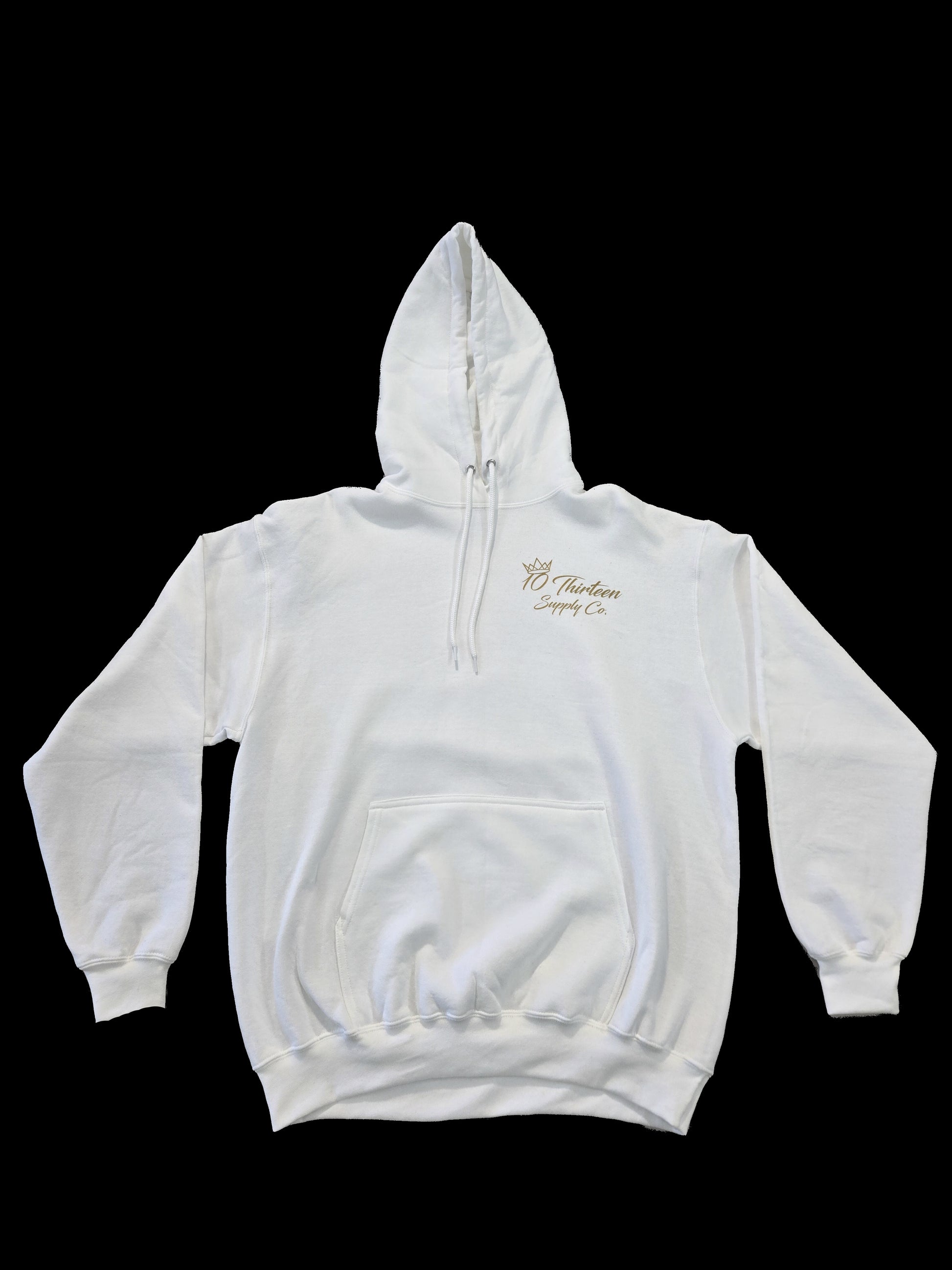 - "NEVER SATISFIED ALWAYS HUSTLIN" HOODIE WHITE/GOLD